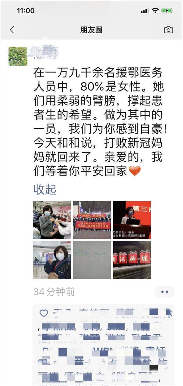 刚到武汉的次日是2月14日。当天夜里,她看到爱人的朋友圈更新了一条信息,里面放着几张她的照片,配文是“亲爱的,我们等着你平安回家”。