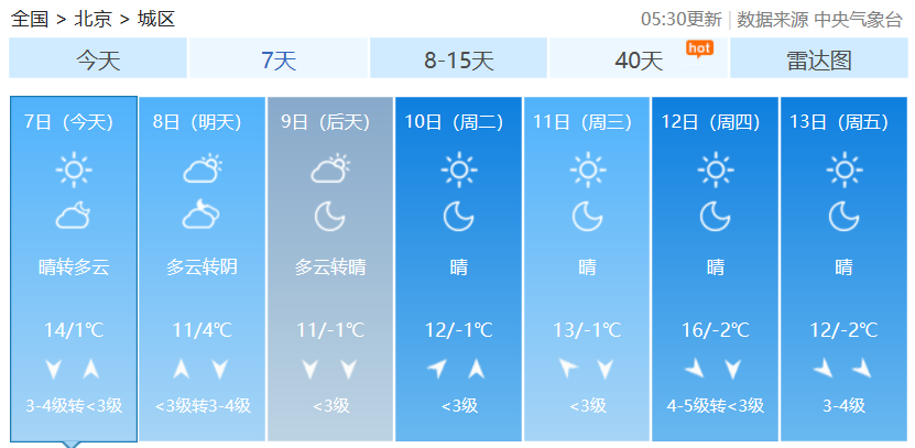 今日北京气温攀升至近期高点 最高气温14℃