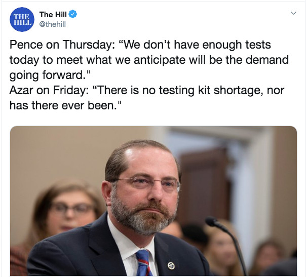 副总统彭斯:我们检测能力不足。美国卫生与公共服务部部长阿扎:试剂盒不缺,从来没缺过。《国会山报》推特截图
