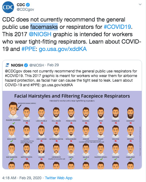 美国疾控中心2月29日发推特:不建议公众戴口罩和呼吸器。推特截图