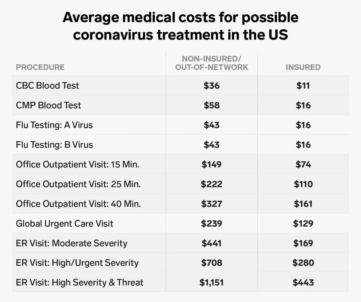 美国医学会提供新冠病毒检测的价目表。图/商业内幕网站