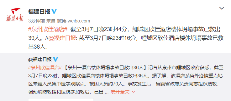 据福建日报官方微博消息,截至3月7日晚23时44分,鲤城区欣佳酒店楼体坍塌事故已救出39人。