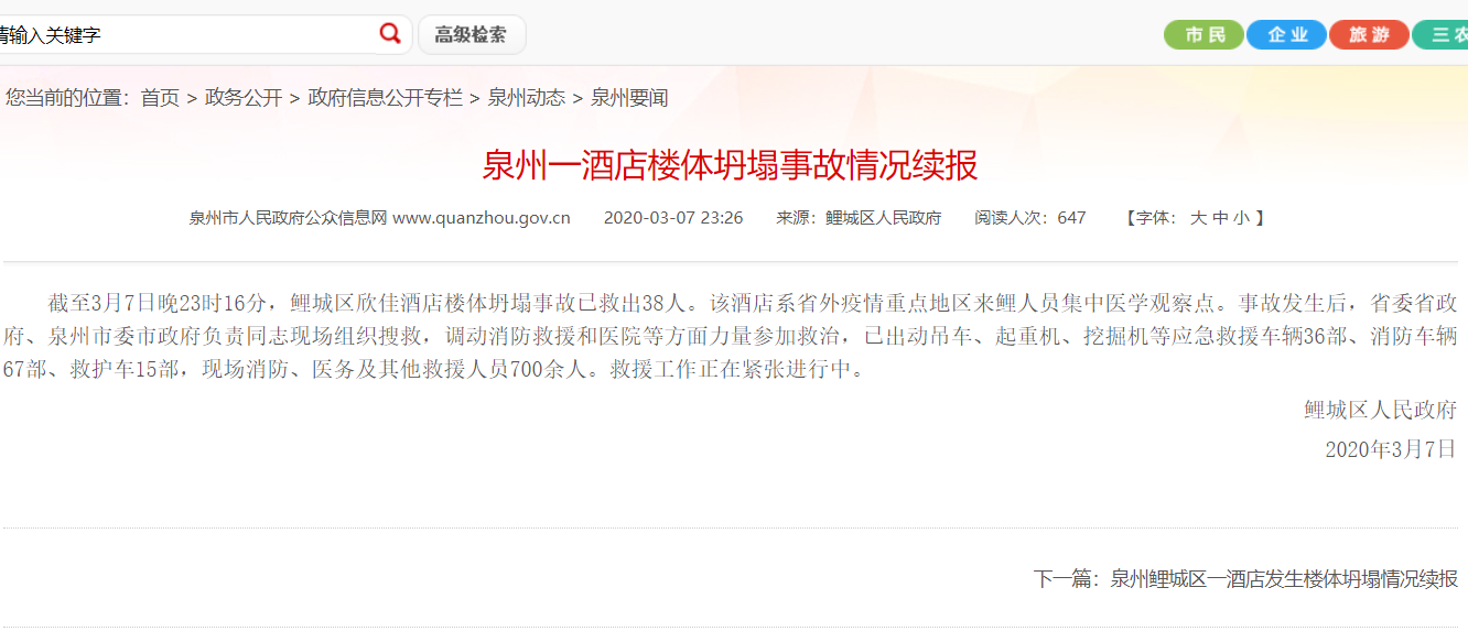 据泉州市人民政府网站消息,截至3月7日晚23时16分,鲤城区欣佳酒店楼体坍塌事故已救出38人。该酒店系省外疫情重点地区来鲤人员集中医学观察点。事故发生后,省委省政府、泉州市委市政府负责同志现场组织搜救,调动消防救援和医院等方面力量参加救治,已出动吊车、起重机、挖掘机等应急救援车辆36部、消防车辆67部、救护车15部,现场消防、医务及其他救援人员700余人。救援工作正在紧张进行中。