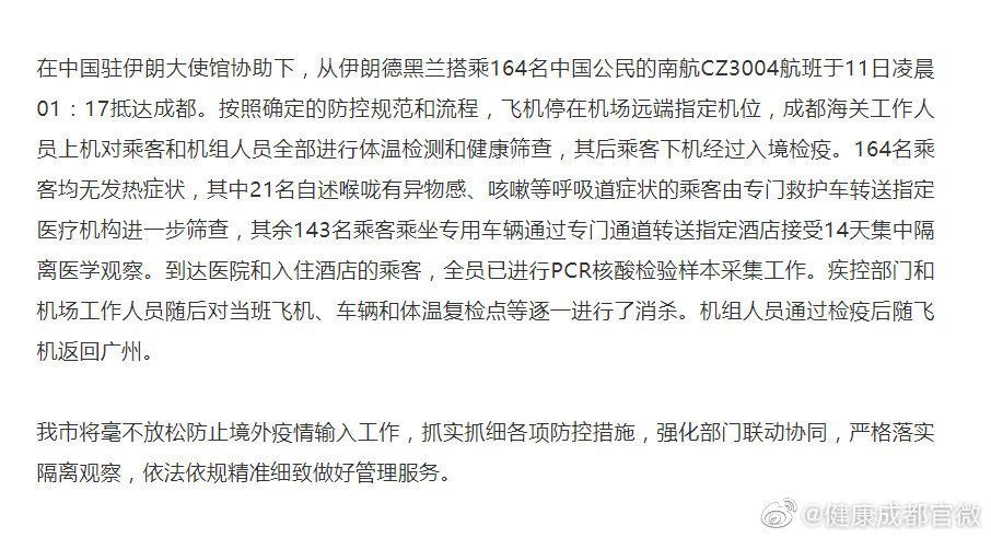 新京报快讯 据成都市卫生健康委员会官方微博消息,在中国驻伊朗大使馆协助下,164名中国公民从伊朗德黑兰搭乘南航CZ3004航班回国,于11日凌晨01:17抵达成都。