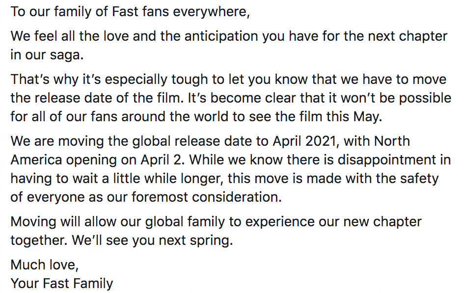 新京报讯(记者 周慧晓婉)3月13日,环球影业出品的系列电影《速度与激情9》官方宣布,因受新冠肺炎疫情影响,该片将在全球范围内撤档,并从原定的今年5月22日档期直接推迟到明年4月2日北美公映,也就是说直接推迟了近1年时间观众才能看到,这也是目前为止档期推迟幅度最大的一部影片。