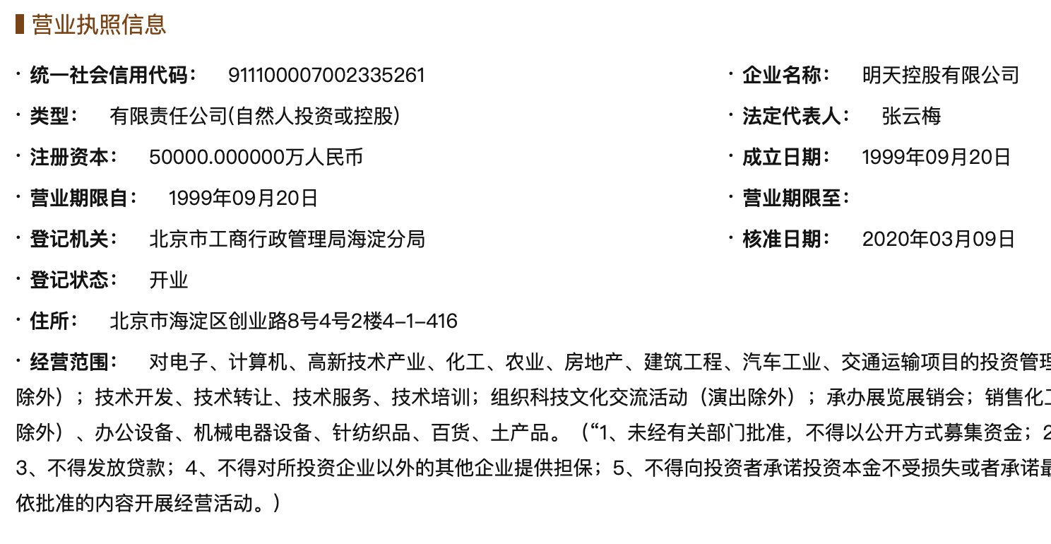 全国工商信用信息公示系统显示,明天控股的法定代表人目前已变更为张云梅。