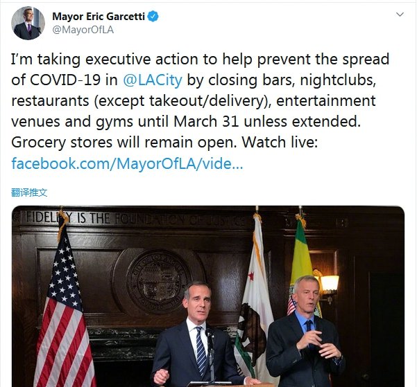 新京报讯 (记者 周慧晓婉)3月16日,继纽约市长命令全市电影院、夜店、小剧场、音乐厅等场地关闭后,洛杉矶市长埃里克·加希提(Eric Garcetti)也宣布采取行政措施,要求全城的电影院、酒吧、夜店、体育馆、健身房关门,餐厅只能外带外卖,杂货店、药房、食品银行继续营业。该命令将持续实施到3月31日,时间可能也会因为疫情状况延长。