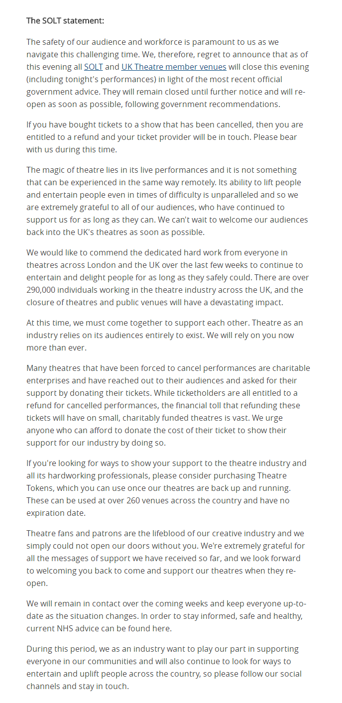 该份声明中还指出,“在过去的几周时间里,伦敦和英国各个剧院里的每一位工作者都在兢兢业业地辛勤工作,我们对此表示赞赏。全英国有超过29万人在戏剧行业工作,剧院和公共场所的关闭,将会对他们产生毁灭性的影响。”