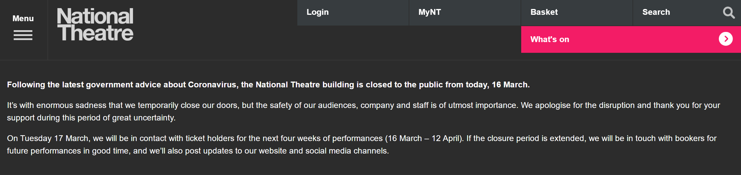 在此之后,包括英国国家剧院、皇家歌剧院在内的多个著名剧院纷纷发布公告,宣布关闭剧院及取消目前上演的所有演出。