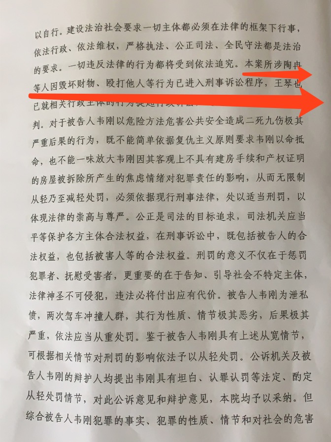 此外,这份刑事判决书显示,经扬州中院调查,陶冉等拆迁人员在实施拆除指定的涉案房屋前,存在随意切断电源、捣毁门前摄像头、敲碎玻璃门、非法侵入曙光路300号等行为,并在韦刚和家人试图进入拆除现场时,有阻拦、拖拽、抢夺手机和拳打脚踢等行为。一定程度上引起韦刚情绪激烈和矛盾激化。