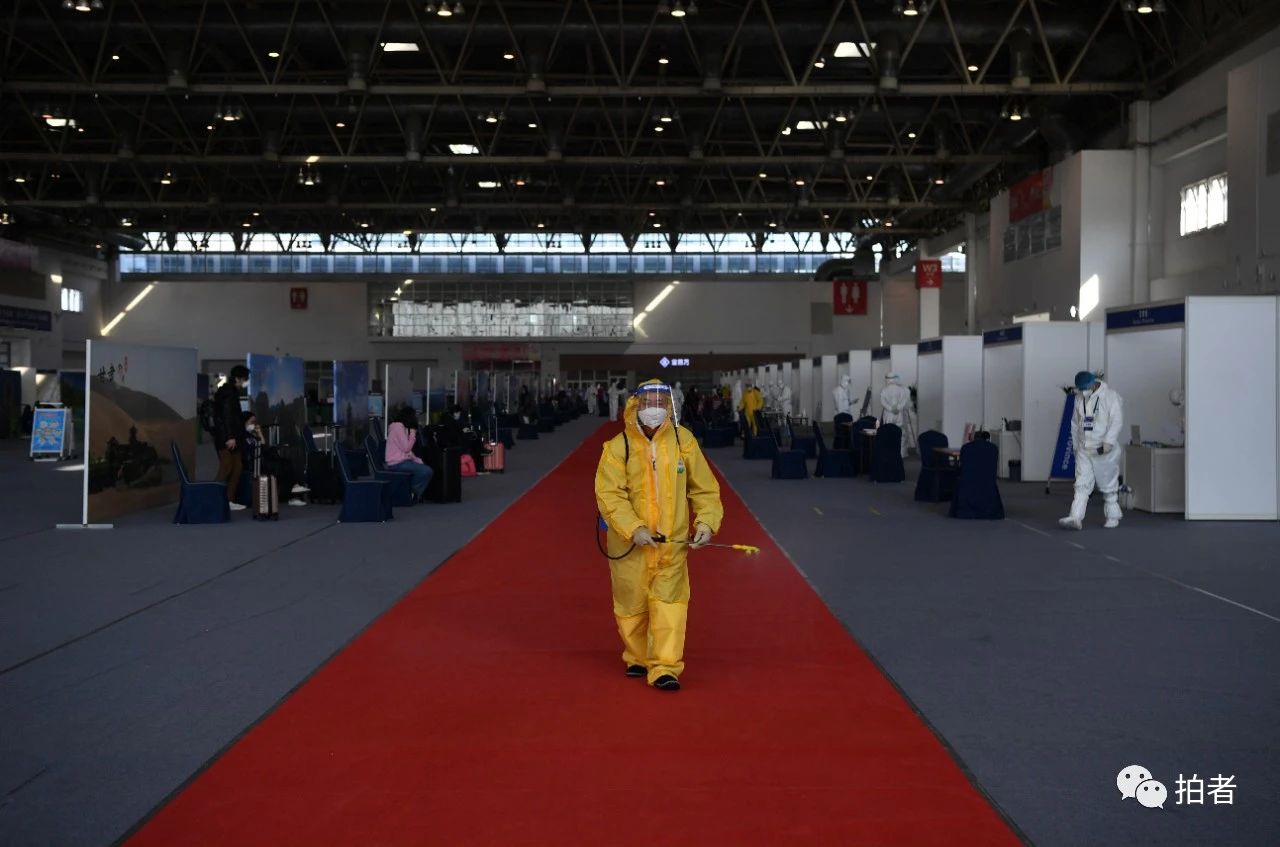 △ 3月17日,新国展,消毒人员在集散点内消杀。