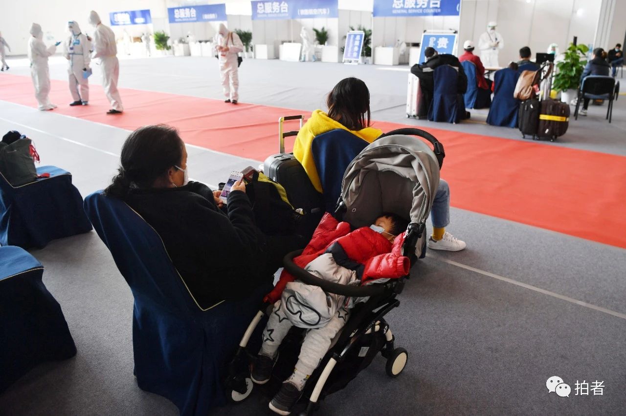 △ 3月17日,新国展集散点内,一名旅客抱着孩子等待登记。