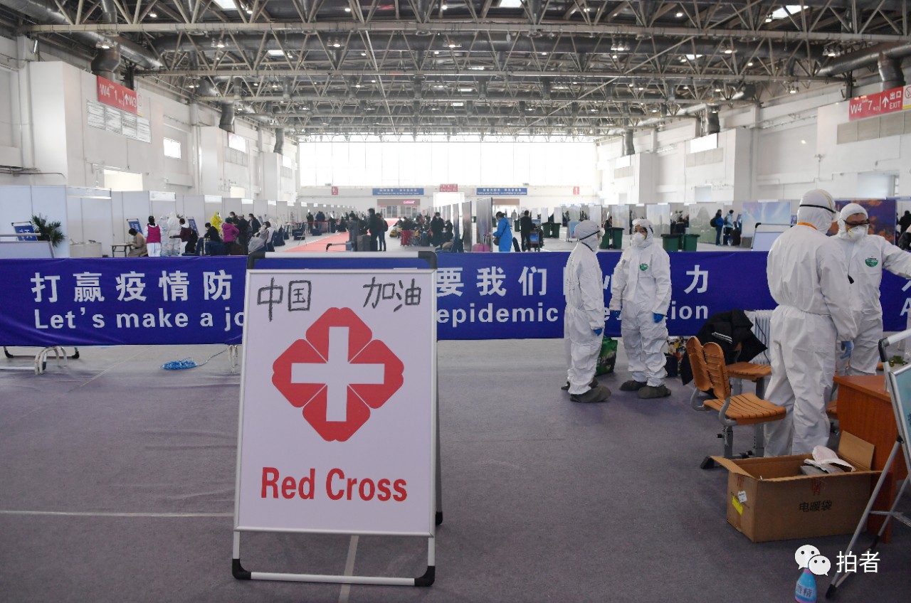 △ 3月17日,新国展集散点内,标志牌上写有“中国加油” 字样。