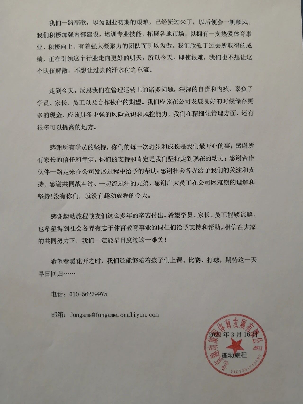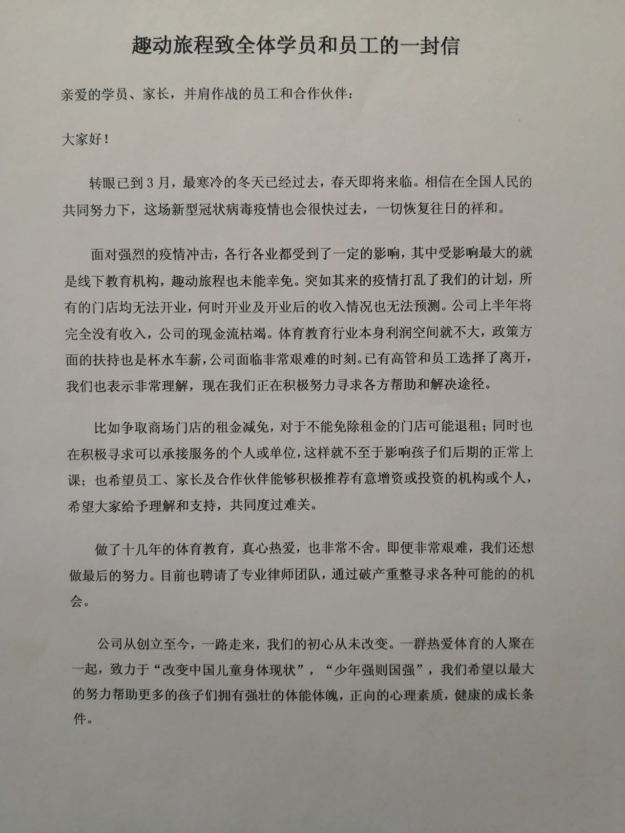 3月16日,家长张女士在微信群中收到一封来自趣动旅程的公开信。信中称,公司正面临上半年完全没有收入、现金流枯竭、部分高管及员工离开等困境,目前已聘请专业律师团队,通过破产重整寻求各种可能的机会,希望家长等积极推荐有意投资的投资人。