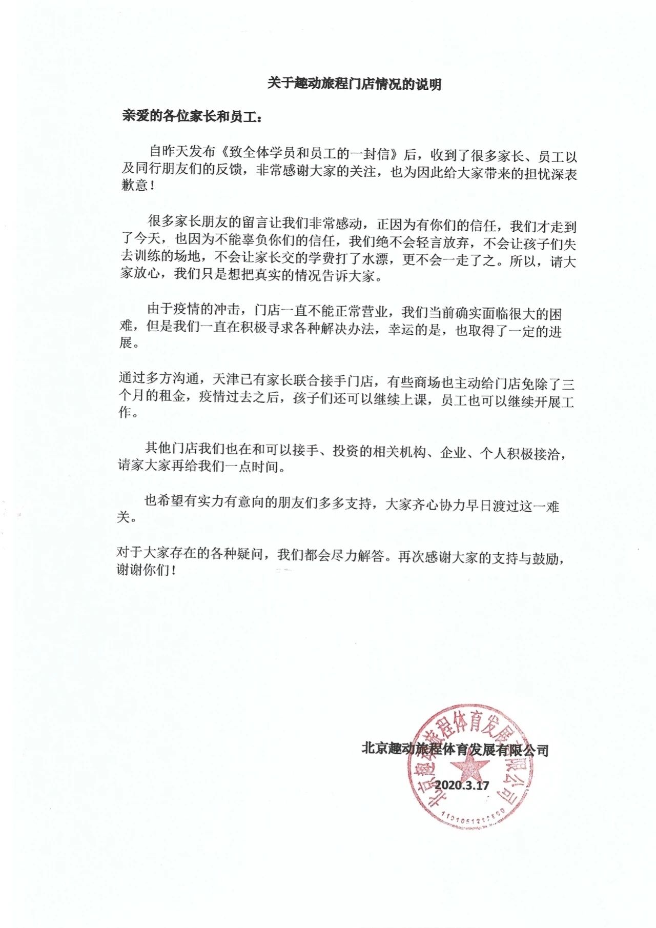 3月17日,趣动旅程又发布了《关于趣动旅程门店情况的说明》,其中称,通过多方沟通,天津已有家长联合接手门店,有些商场也主动给门店免除了三个月的租金。疫情过去后,孩子们还可以继续上课,员工也可以继续开展工作。新京报记者注意到,其中未提及学费余额如何处理。