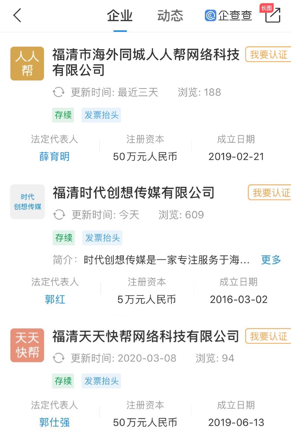 新京报记者从上述部门获得的一份通报显示,发布上述相关虚假文章的微信公众号注册主体涉及3家企业,分别为:福清市海外同城人人帮网络科技有限公司、福清天天快帮网络科技有限公司和福清时代创想传媒有限公司。