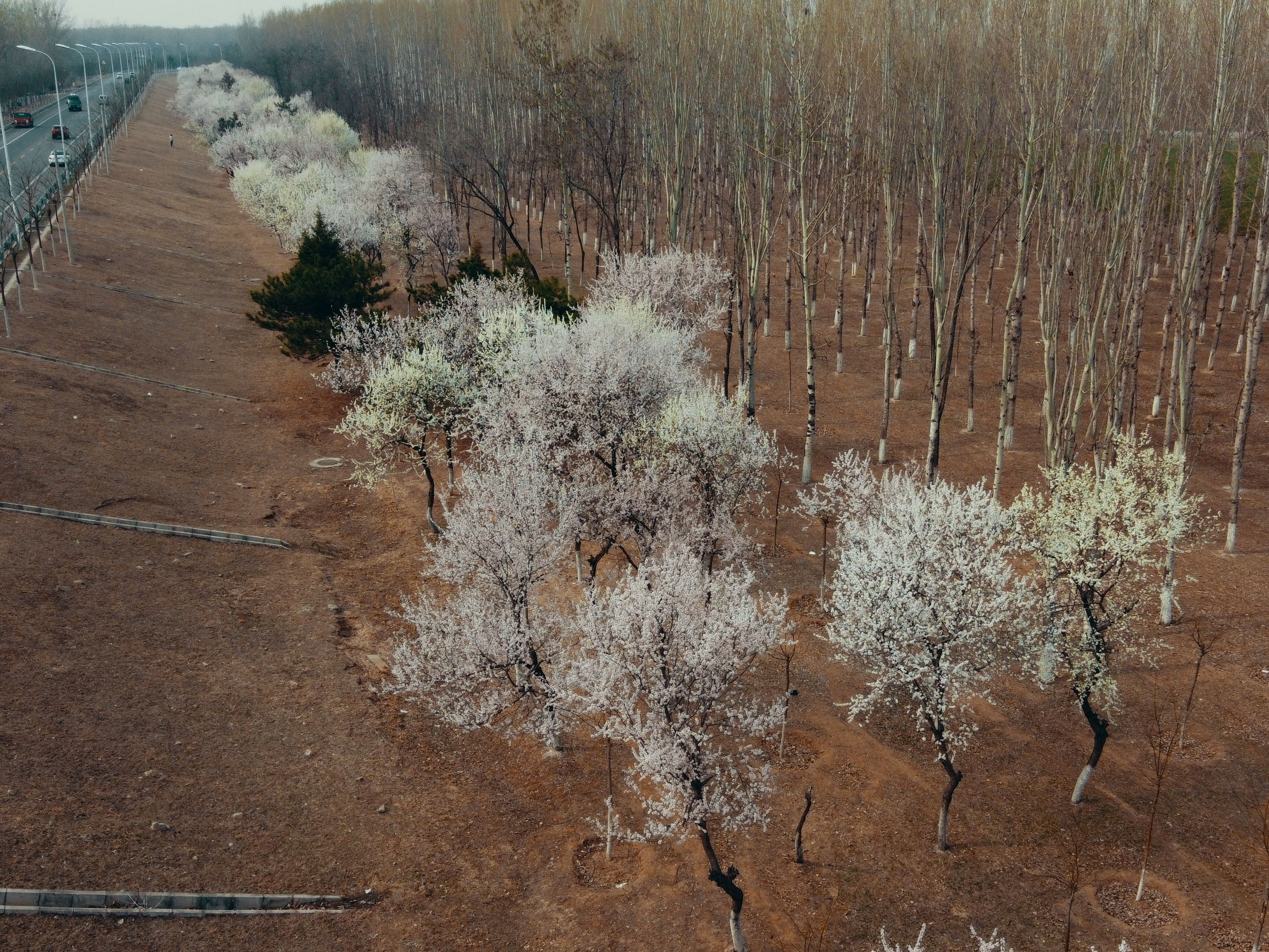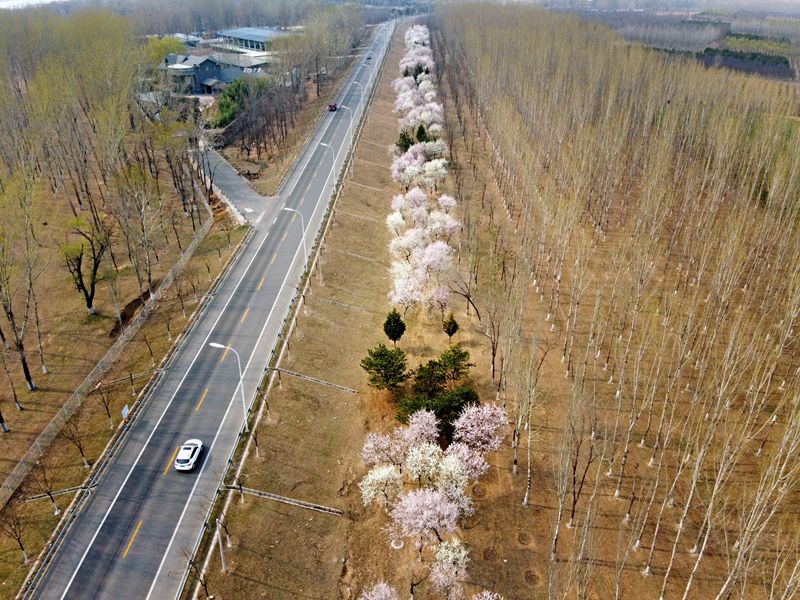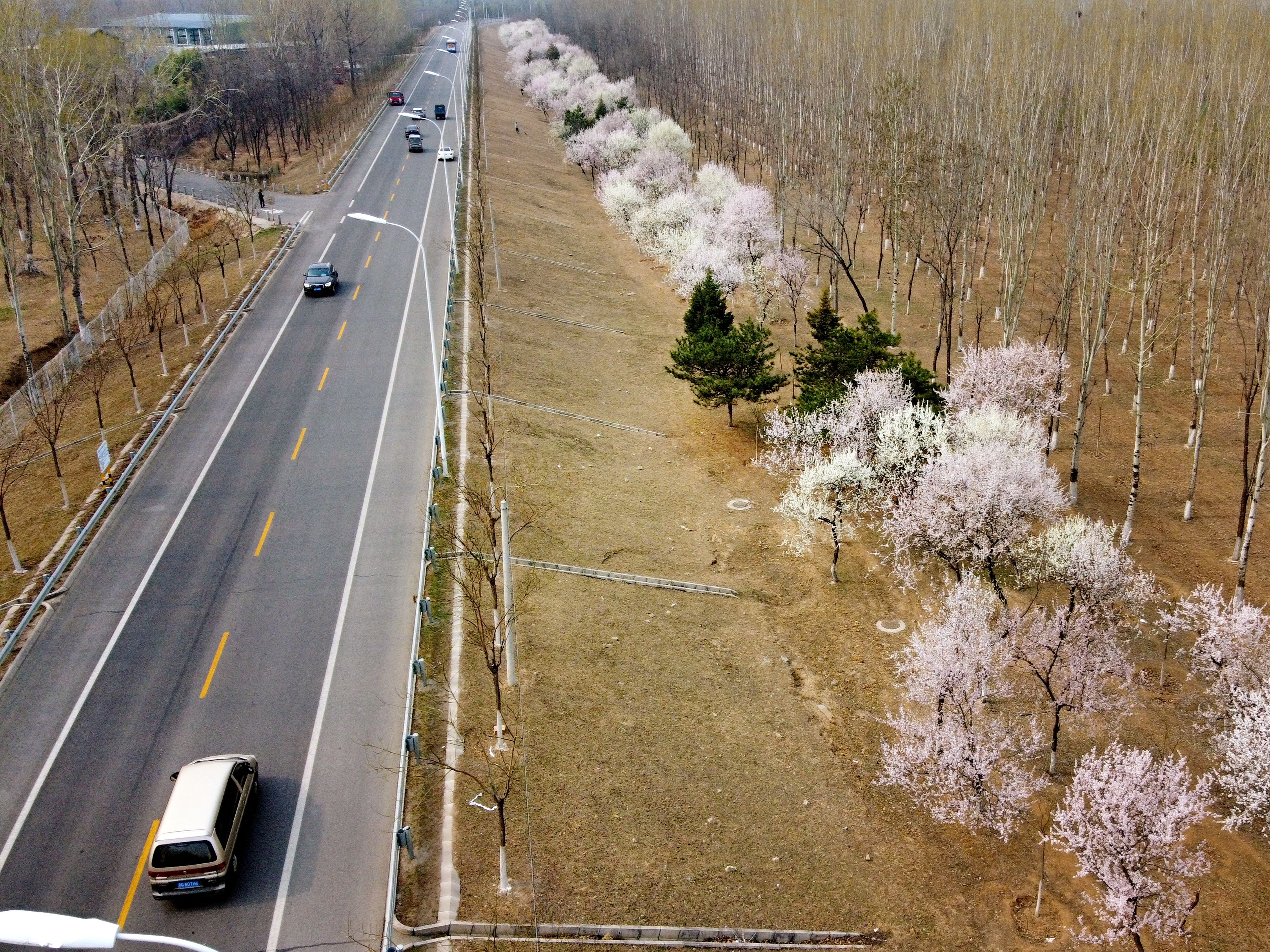 顺义潮白河左堤路边的几十棵桃树已经是花满枝头。新京报记者 王巍 摄