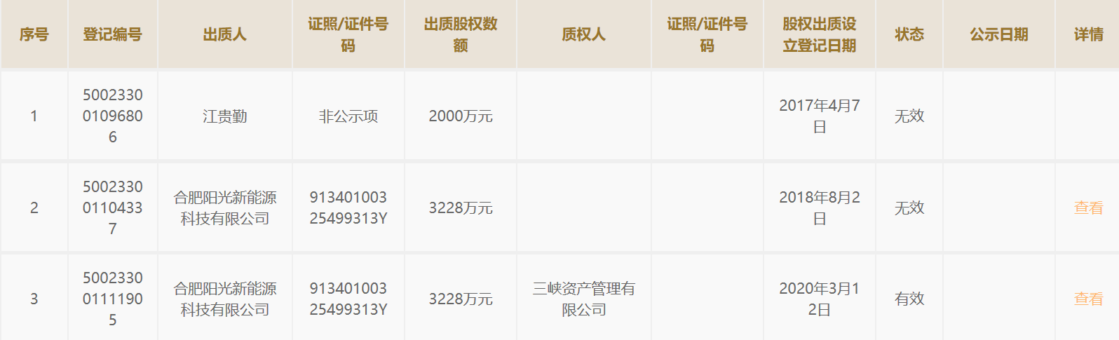 值得注意的是,去年10月,合肥阳光曾将持有的峻阳新能源全部股权—23736万股出质予江苏金融租赁股份有限公司,登记编号为371724201906210004。目前该条股权出质登记信息状态已为“无效”。