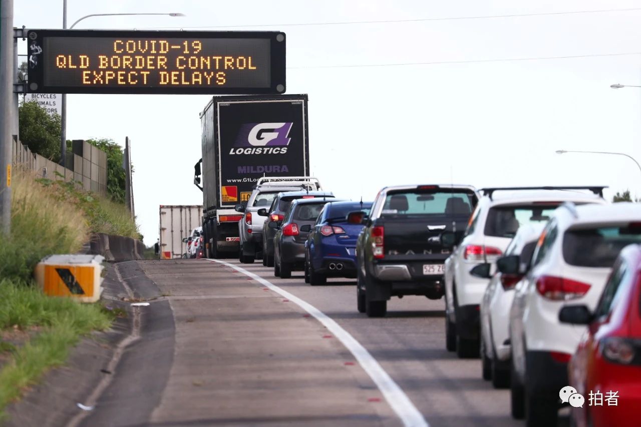 △ 当地时间3月26日,澳大利亚昆士兰州边界附近的新南威尔士州太平洋公路上,排长龙等待通行的车辆。提示牌上写有“新冠肺炎 昆士兰边境管控 预计延迟”字样。