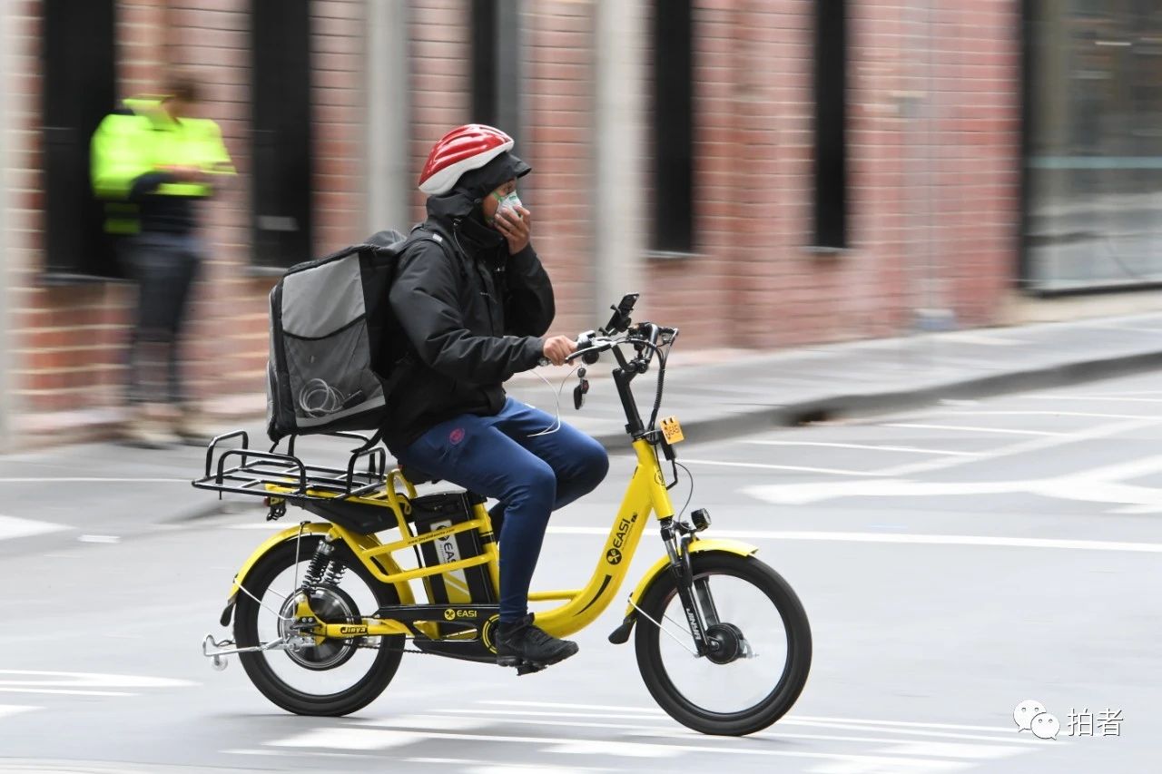 △ 当地时间3月25日,澳大利亚墨尔本街头,送货员戴着口罩疾驰而过。