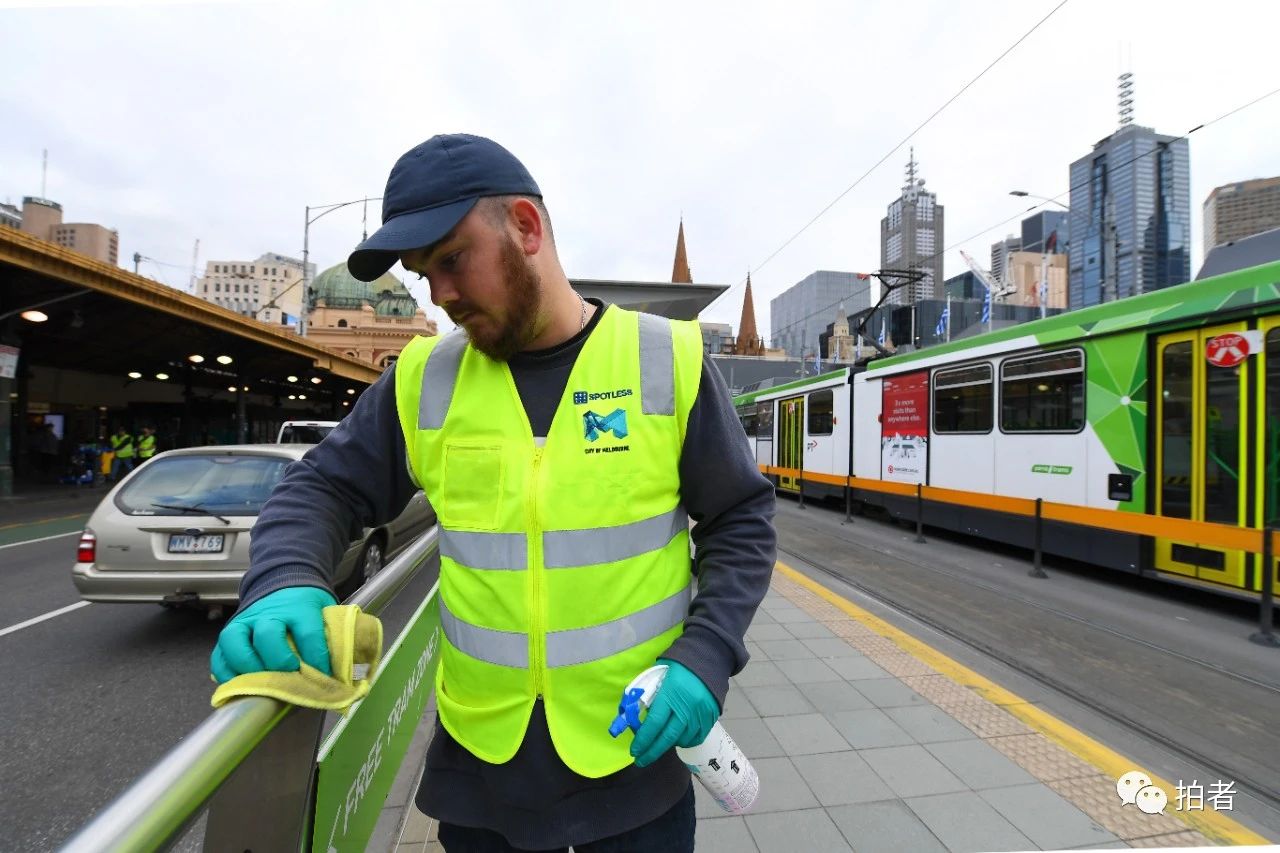 △ 当地时间3月25日,澳大利亚墨尔本,一名清洁小组成员在消毒电车站台栏杆。墨尔本市议会发起了一场清理突击行动,以帮助遏制新冠肺炎的传播。