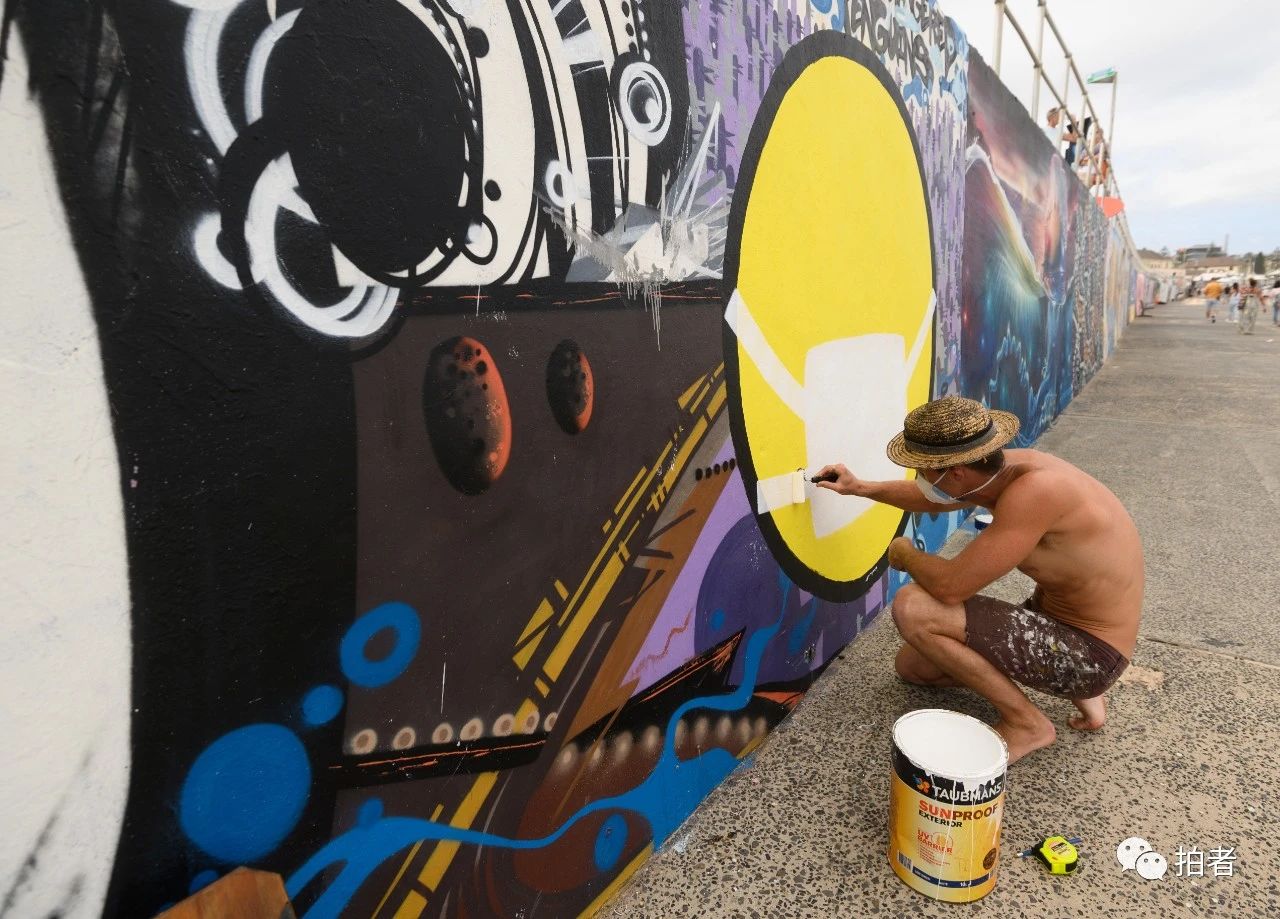 △ 当地时间3月21日,澳大利亚悉尼邦迪海滩海滨长廊,一名艺术家给自己的壁画主角画上了口罩。