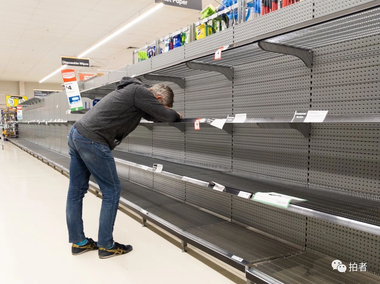 △ 当地时间3月17日,澳大利亚墨尔本一超市内,因为民众的恐慌性囤货,卫生纸被抢购一空,买不到纸的男子沮丧地趴在货架旁。
