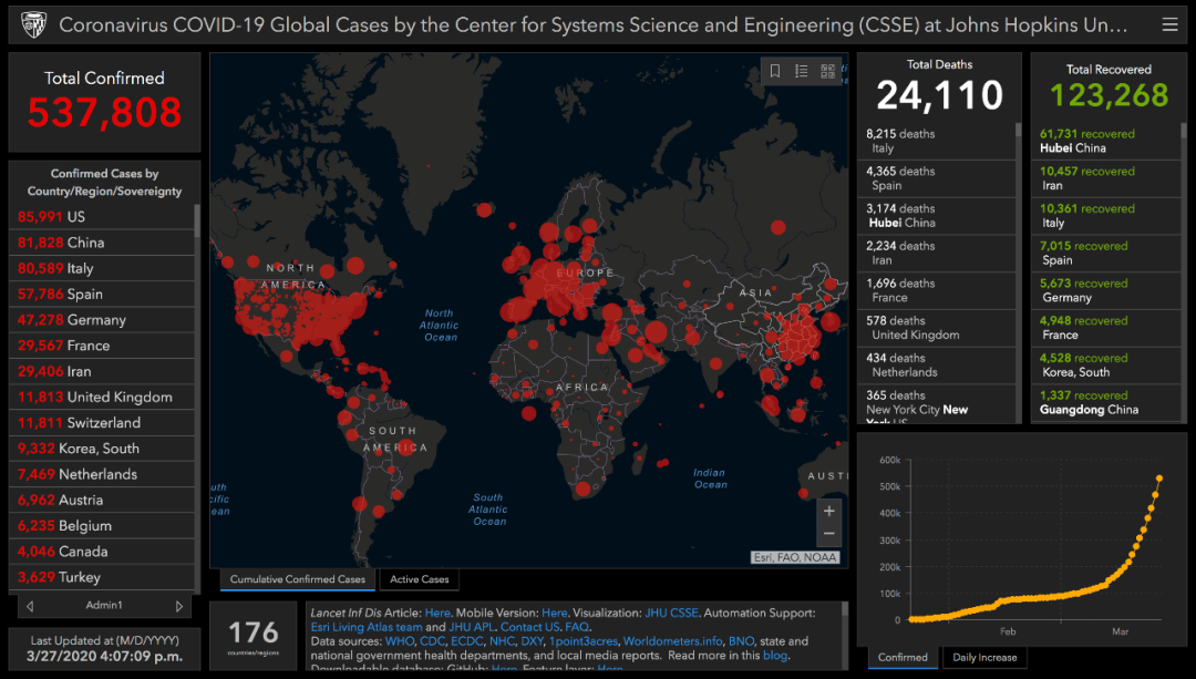 根据美国约翰斯·霍普金斯大学公布的全球实时疫情数据,截至北京时间3月27日17时,全球累计确诊新冠肺炎病例537808例,累计死亡病例24110例。