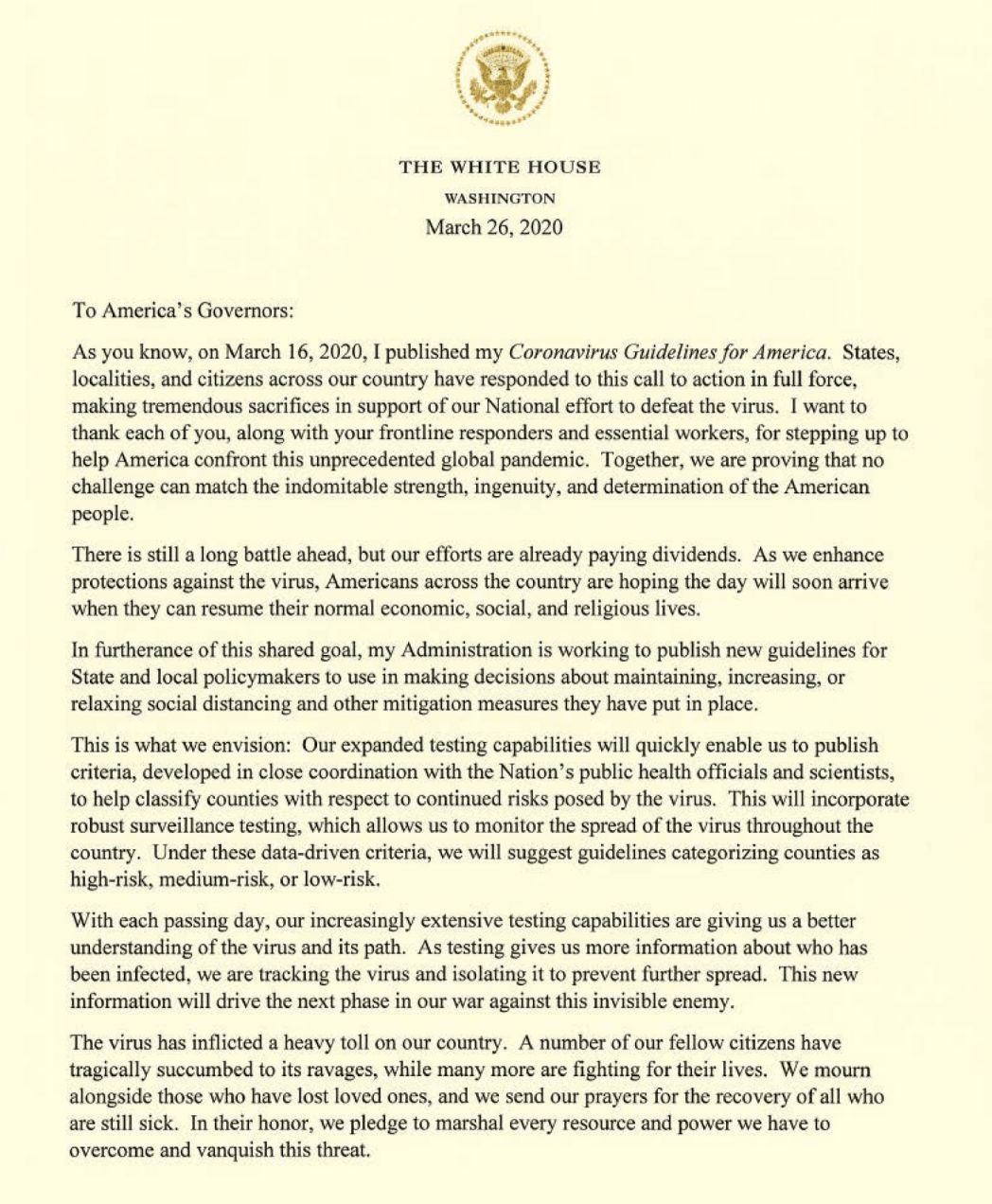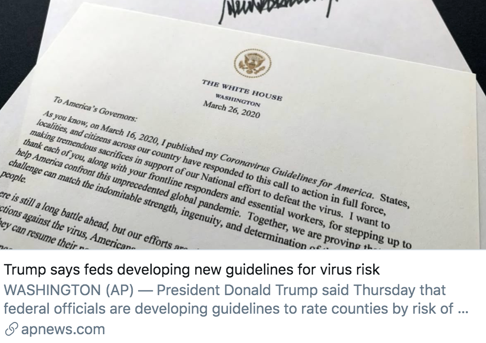 据《纽约时报》报道,当地时间3月26日晚,特朗普写信给各州州长。特朗普表示,联邦官员正在制定新的疫情指导方针,将根据新冠病毒传播的风险对各州进行评估,分为“高风险、中风险和低风险”地区。
