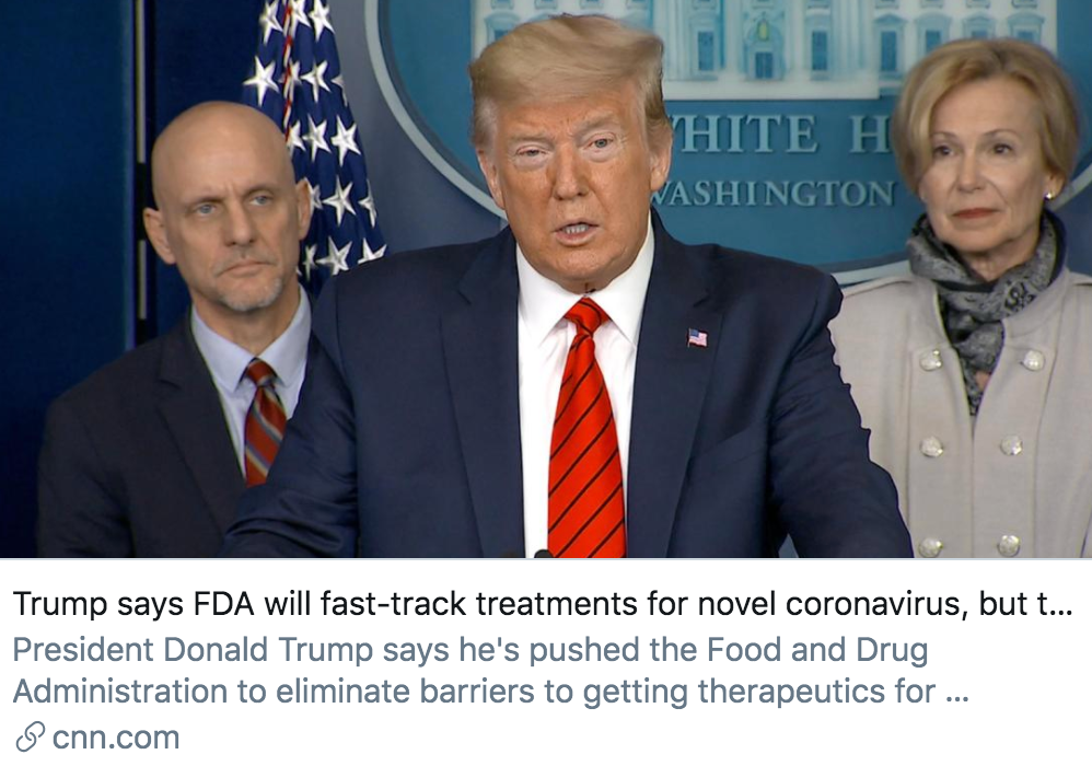 3月19日,特朗普在白宫举行的疫情通报会上表示,“一种抗疟疾药有可能很快应用于治疗新冠肺炎,美国食品和药物管理局(FDA)已经通过处方的批准了”。然而,出席疫情通报会的FDA局长哈恩表示,该药物仍需在临床环境中进行测试。同天,美国国家过敏症和传染病研究所所长安东尼·福奇对CNN表示,没有“神奇的药物”可以治愈新冠肺炎,目前没有发现治疗新冠肺炎的有效方法。