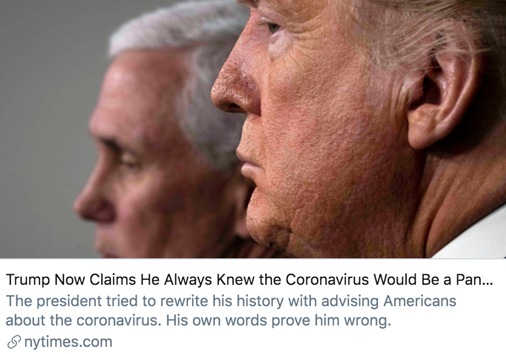 特朗普还未认真对待大流行。3月17日,特朗普表示,“我一直都知道这是一场流行病。早在它成为大流行之前,我就觉得它是一场大流行病了,我一直都认为它很严重”。但《大西洋月刊》指出,特朗普在美国暴发疫情时曾一再淡化新冠肺炎的严重性,认为这只是一场普通流感。