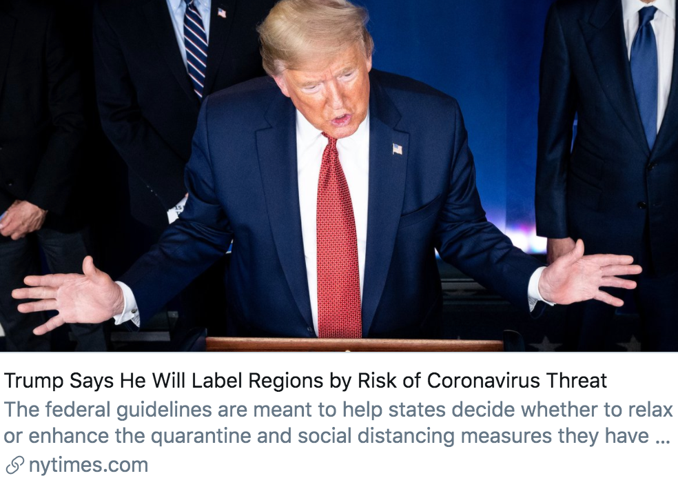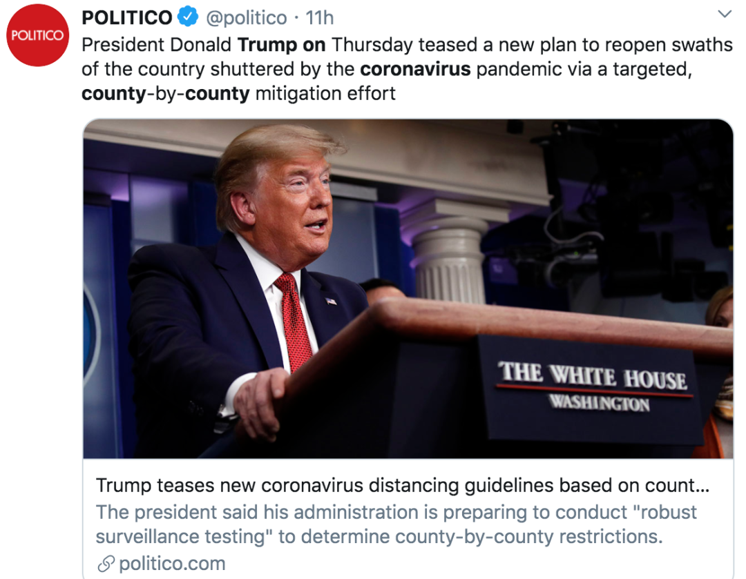 据美国政治新闻网站politico报道,特朗普表示,新的指导方针旨在取消对美国民众的出行限制,缓解疫情造成的经济破坏。