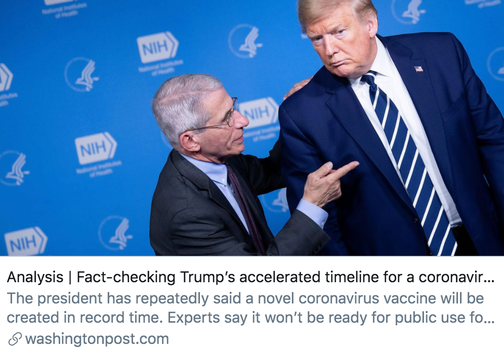 当天早些时候,白宫方面曾与美国医药界专家召开会议。专家团队指出,可能需要12个月至18个月的时间来研制疫苗。特朗普表示,他更希望几个月的时间就能研发出疫苗。随后,在北卡罗莱纳州的竞选造势活动中,特朗普声称,疫苗将“很快”准备好。