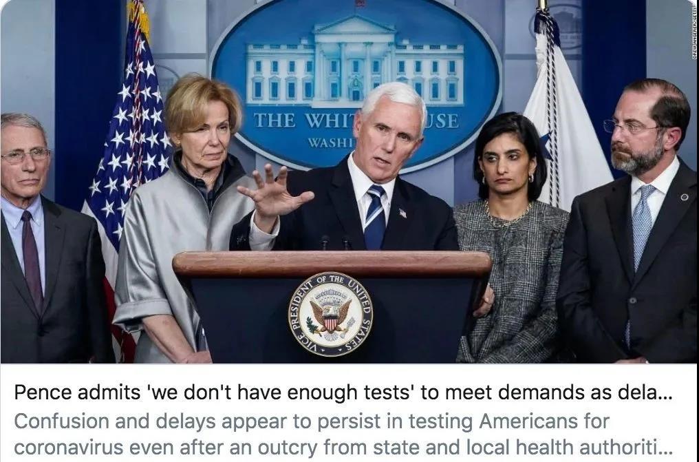 其次,特朗普不了解病毒检测的需求。3月6日,特朗普表示,“任何需要测试的民众都可以接受病毒检测,我们有足够的检测试剂盒”。但是,副总统彭斯于3月5日考察明尼苏达州的3M工厂,在接受媒体采访时,彭斯承认,“目前没有足够的检测试剂盒来满足检测需求”。