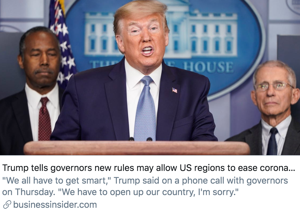 随后,在接受福克斯新闻的采访时,特朗普表示,“我认为,我们可以先从低风险地区开始,逐渐放宽目前的防疫措施”。