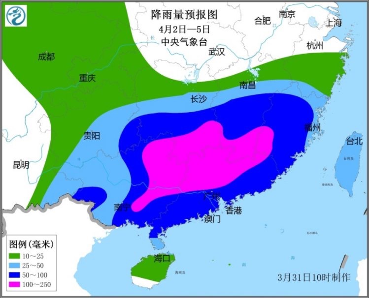 预计,新一轮降水过程中,湖南南部、江西中南部、福建西南部、广西东部和北部、广东中北部等部分地区有暴雨,局地大暴雨,部分地区并伴有短时强降水,局地雷暴大风等强对流天气,累计降雨量有100-150毫米,局地可达200-240毫米。最强降雨时段为4月2日至3日,强降雨位于江南南部至华南中北部一带;4月4日至5日,强降雨逐渐南压至华南中南部,降雨强度减弱。