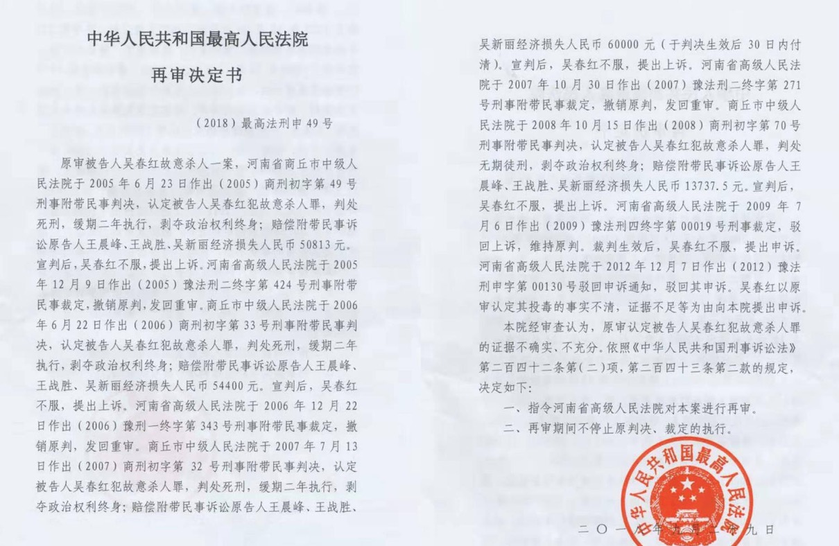 吴春红提出上诉后,河南高院裁定驳回上诉,维持原判。此后,吴春红的申诉亦被河南高院驳回。服刑期间,吴春红坚决不认罪,并拒绝减刑。2016年6月3日,他向最高法院提起申诉。2018年10月3日,吴春红的女儿吴莉莉收到最高法院的《再审决定书》:“吴春红犯故意杀人罪的证据不确实、不充分。指令河南高院对此案进行再审。”