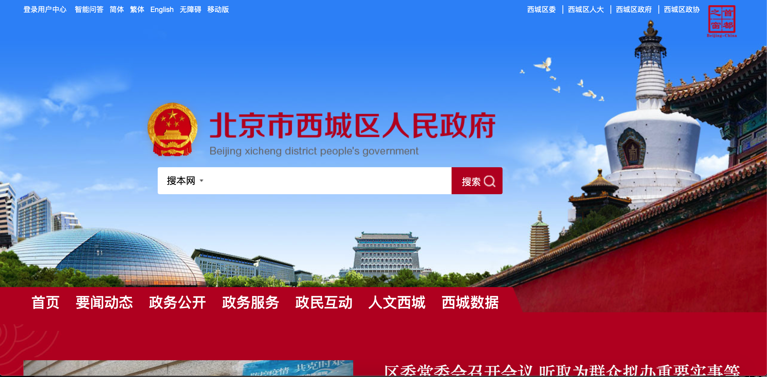 西城区政府网站使用的形象较多,包括红墙、白塔、正阳门、国家大剧院等多个建筑形象。