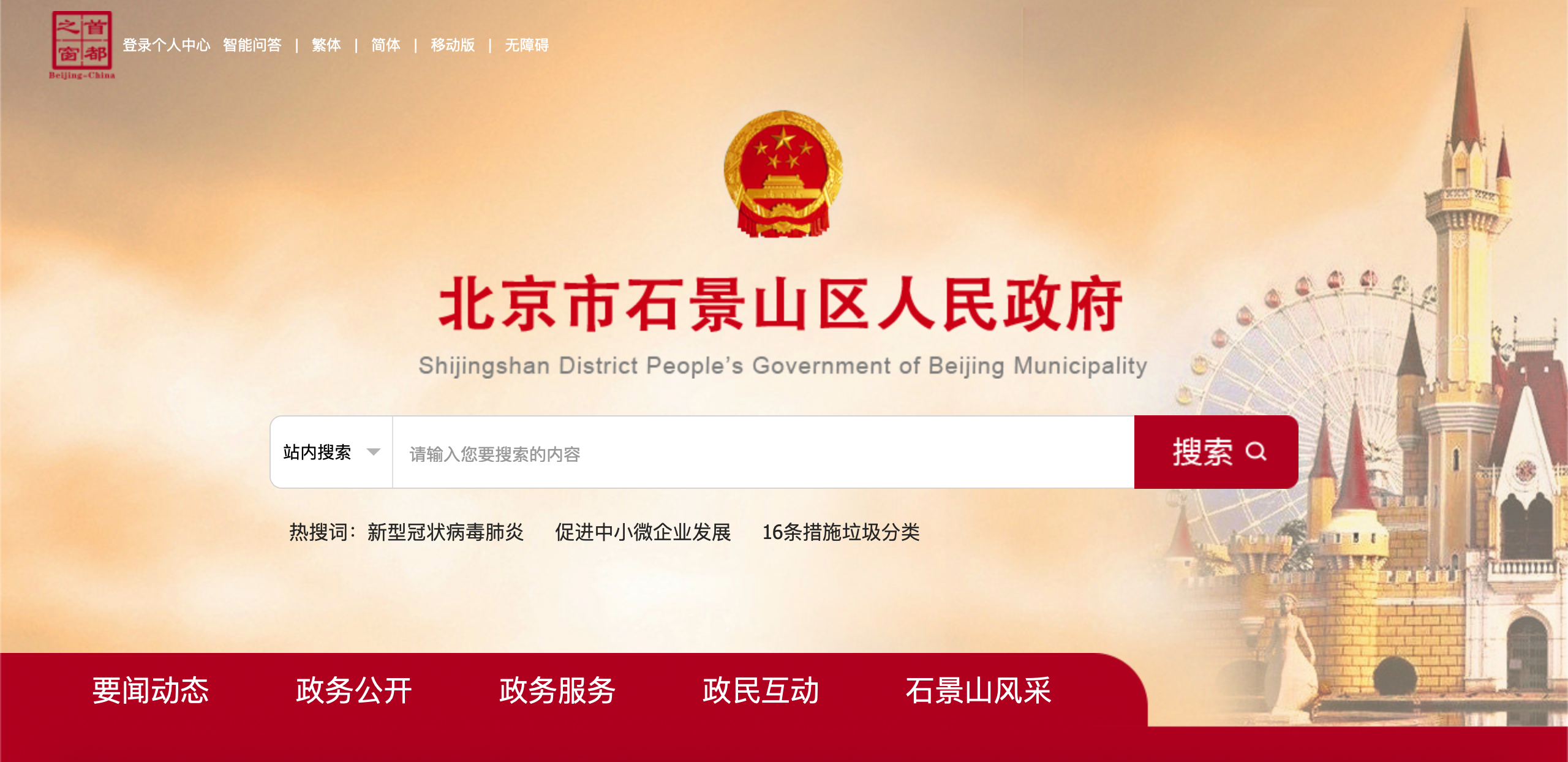 两个区政府网站使用了现代建筑、场所的形象,其中,石景山区政府网站右侧使用石景山游乐园的城堡和摩天轮形象;怀柔区政府网站首屏在右侧使用了雁栖湖国际会展中心的形象。