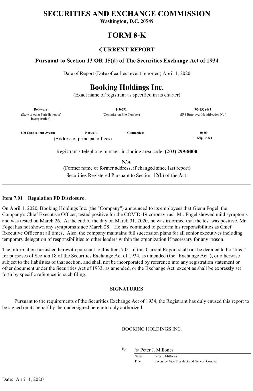 新京报讯(记者 王真真)4月2日,在线旅行预订服务公司Booking Holdings(以下简称“Booking”)向美国证券交易委员会(SEC)提交的一份文件显示,Booking在美国当地时间4月1日向员工宣布,公司首席执行官(CEO)格伦·福格尔(Glenn Fogel)的新冠病毒检测呈阳性。