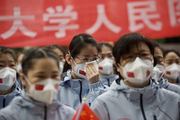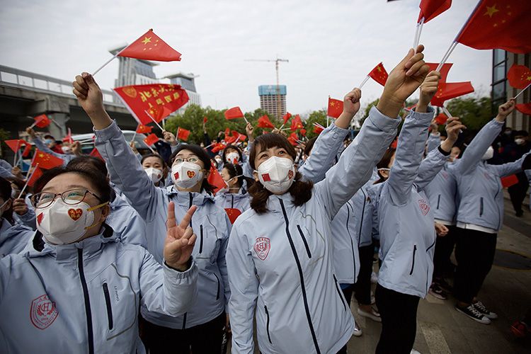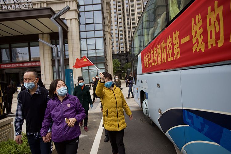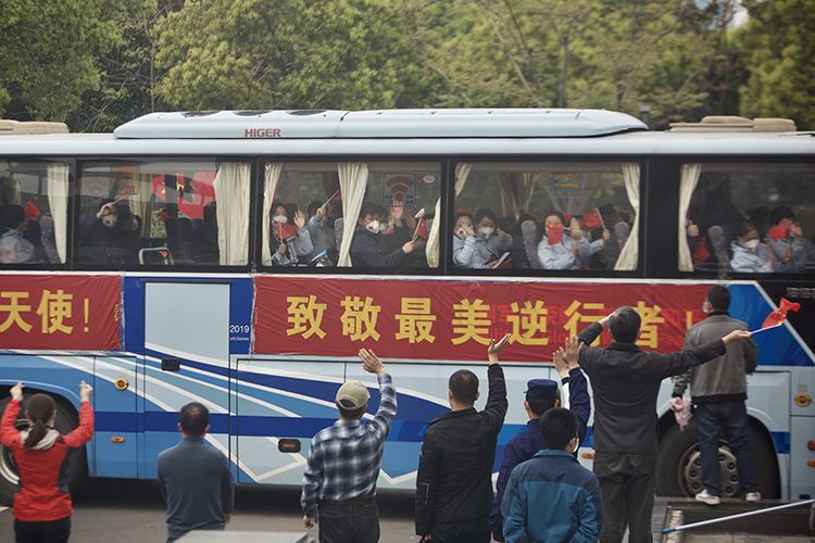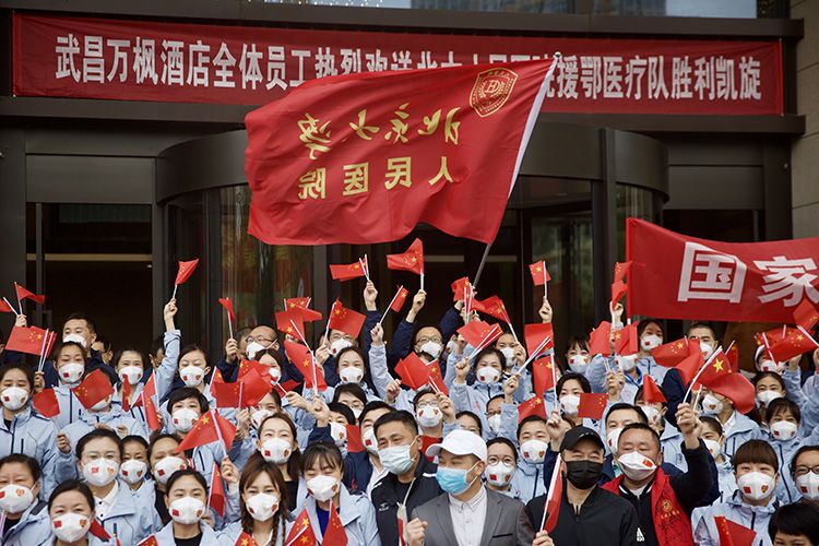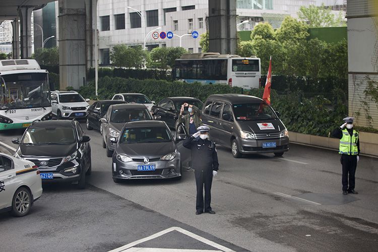 医疗队的车队即将开动,武汉市民挥舞着国旗道别。