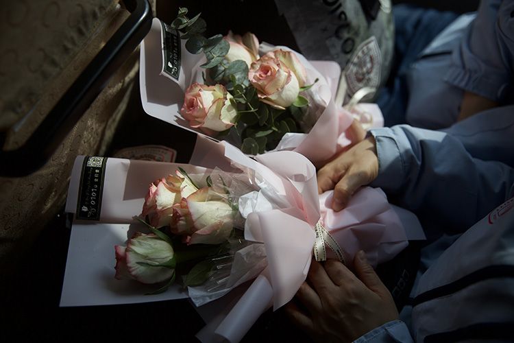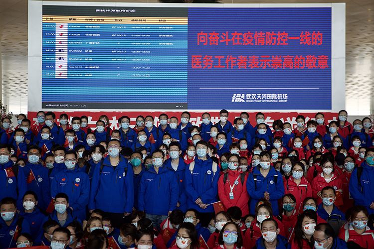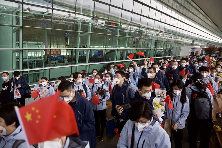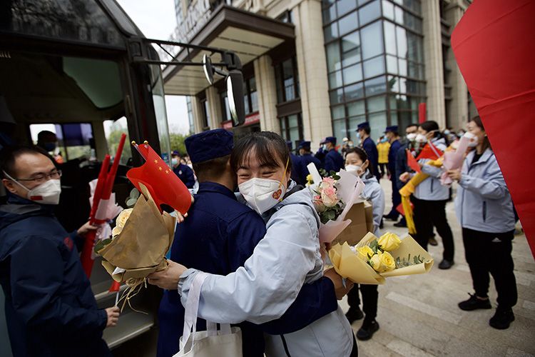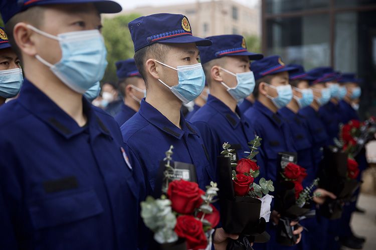 医疗队员们紧握武汉人民送给他们的鲜花。