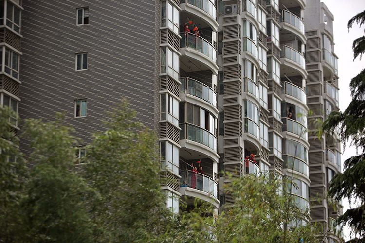 驻地旁边的居民楼上,居民在阳台,向医疗队挥手告别。
