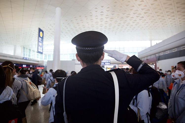 机场安检口,执勤的安保人员向医疗队敬礼。