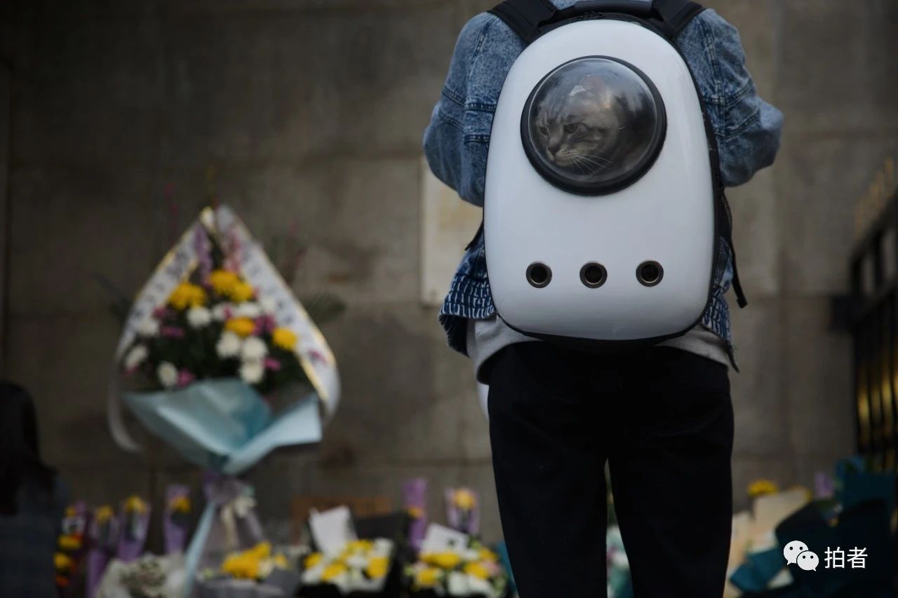 △ 4月4日,汉口江滩一元路广场旁,背着宠物的市民摆放鲜花悼念逝者。
