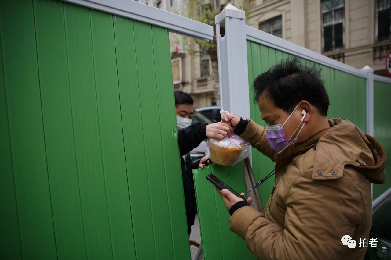 △ 4月6日,得胜桥老街上,餐饮店服务员将食物打包,举过围挡递给顾客。