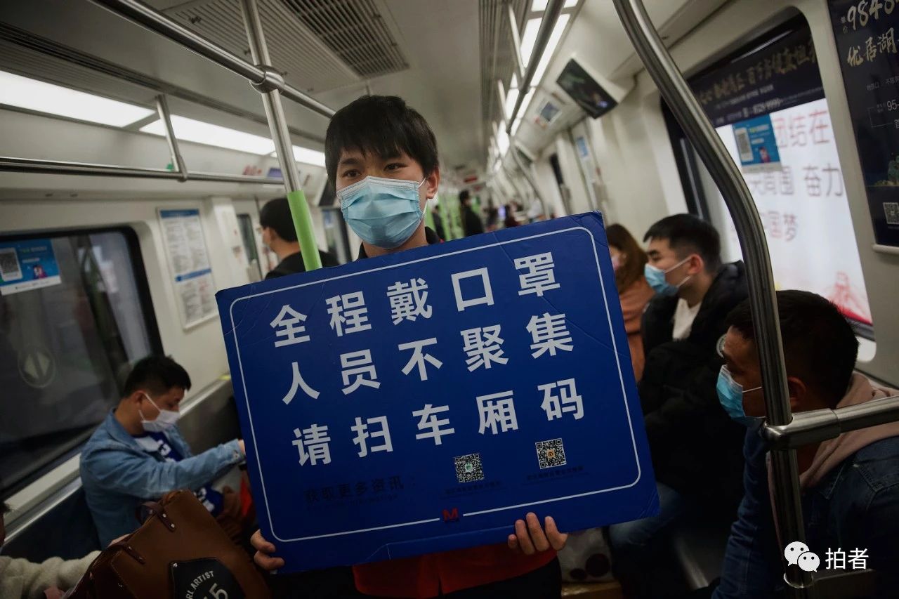 △ 4月5日,武汉地铁2号线,“随车安全员”高举提示牌来回巡视。旅客乘坐公交或地铁时,需要出示湖北省健康绿码,扫描“武汉市实名登记乘车二维码”。