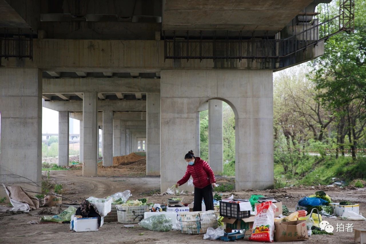 △ 4月1日,汉黄路,菜贩在立交桥下卖菜。