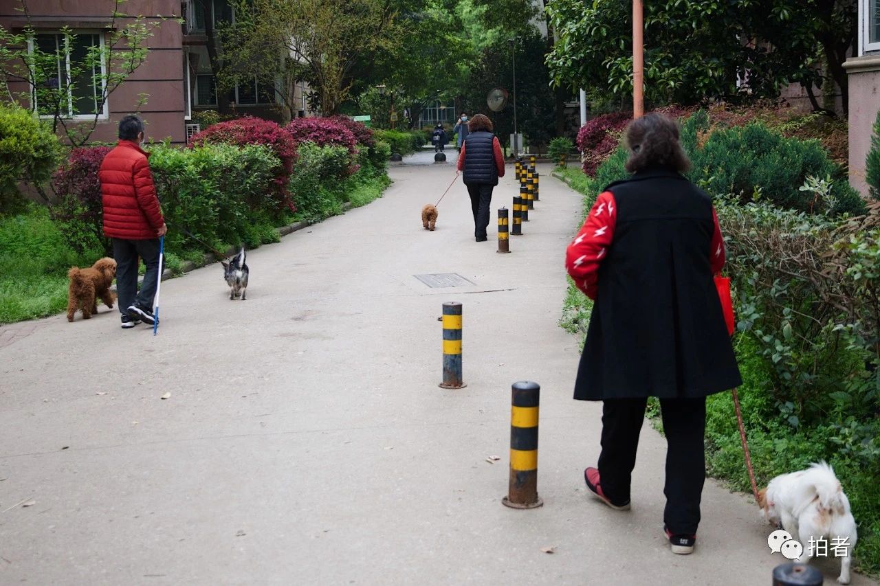 △ 4月3日,百步亭社区,居民在小区内遛狗。