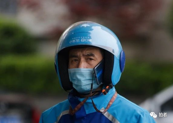 △ 4月2日,吉庆街,外卖员将手机夹在摩托车头盔里打电话。